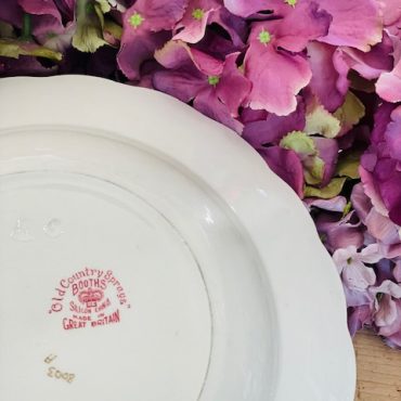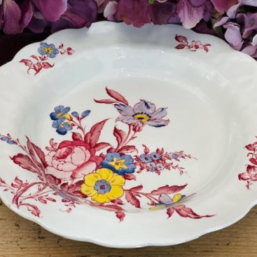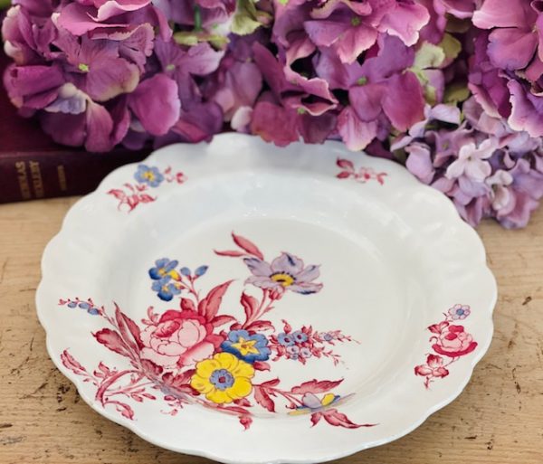 Piatto fondo originale, di manifattura Booths anni ’30, con decorazione floreale sui toni del rosa, del blu e del giallo