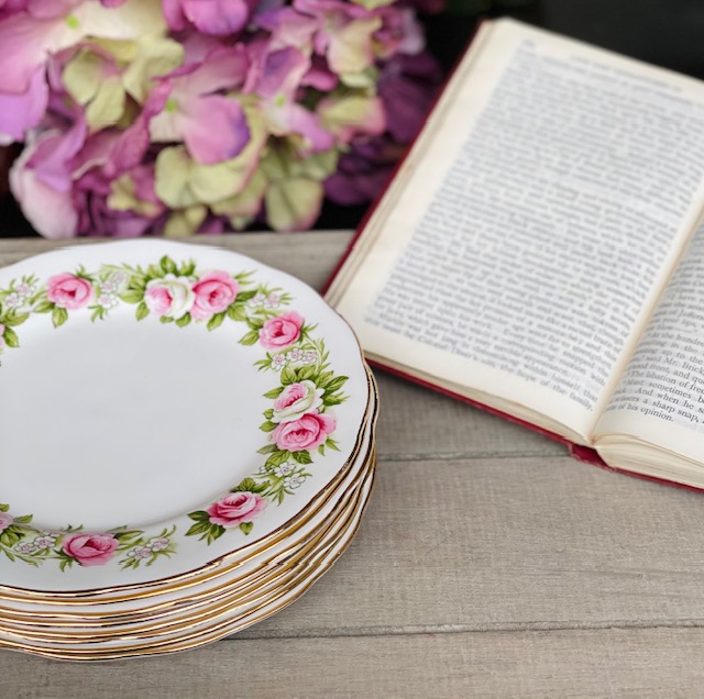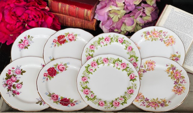 Set composto da 8 piattini da dolce Mix’ n’ Match, con decoro floreale e rifiniture in oro, di manifattura inglese della metà del ‘900